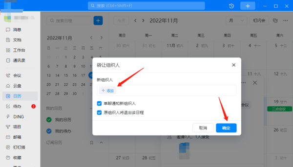 6、对于转让组织人,小编告诉大家,点击之后在弹出的页面里点击添加好友后,并点击确定就转让成功了。