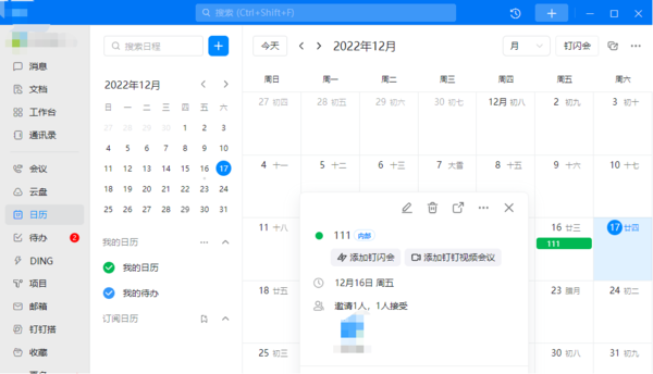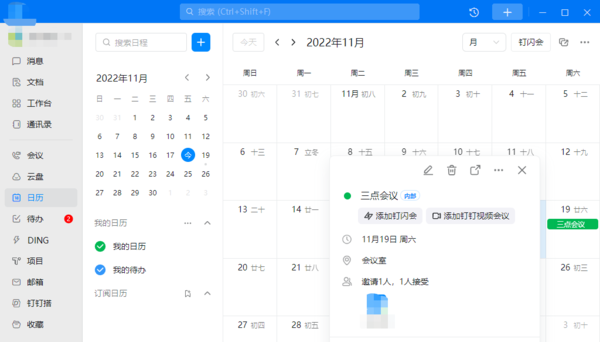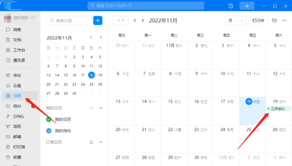 1、首先第一步进入到电脑版钉钉的主界面,在左侧的工作栏里点击日历,这时就可以看到我们之前创建好的日程了。