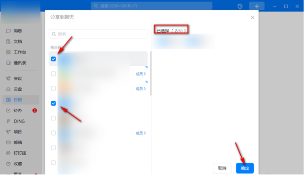 4、选择“分享到聊天”以后,只需要勾选上你想要分享的好友,勾选以后就会在右侧显示出分享的人数和好友名字了,然后点击确定,就代表分享出去了。