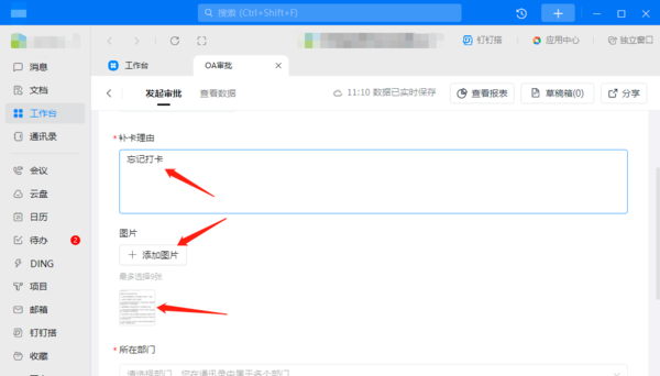 4.填写完时间以后,下方有一个补卡理由的输入框,这个输入框也是必填项,我们需要填上自己忘记打卡的原因,比如网络原因或者忘记打卡,在这里就如实填写就可以,写完理由以后还可以上传图片,但是这个不是必填项,如果没有图片也可以不传。