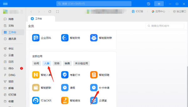 2.进入到工作台以后,在全部应用里选择“人事”选项,就可以看到有一个补卡申请了,如下图箭头所指。