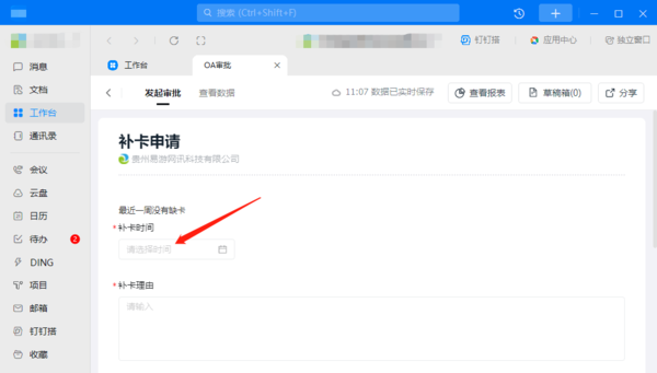 3.进入到“补卡申请”页面后,可以选择自己补卡的时间,也就是填写上应该打卡的时间。