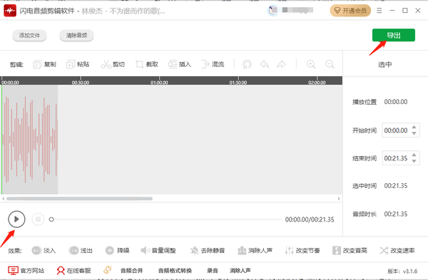 3、此时灰色的区域会被保留下来,其他部分被删除,可以点击【播放】试听效果,确认无误后,点击【导出】即可。