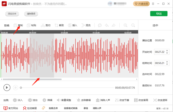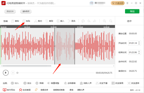 4、也可边播放音频判断需要复制区域,复制粘贴部分音频,最后点击【导出】即可。