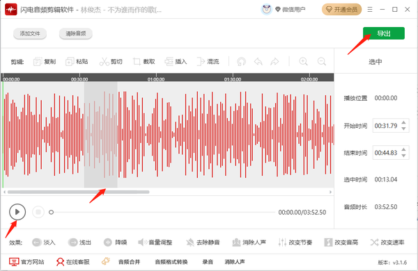 4、可以看出刚刚选中的音频段落明显有变化,可点击【播放】,试听最终效果,完成后点击【导出】。