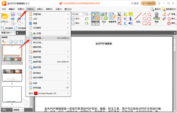 1、打开金舟PDF编辑器,点击【打开PDF文件】将要进行提取的文件打开。点击菜单栏【文档】,选择【提取页面】。