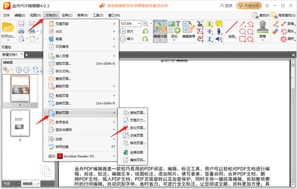 2、点击菜单栏【文档】,选择【更多页面】,点击【拆分页面】。