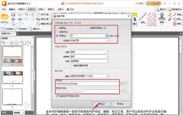 2、选择需要提取的页面,修改文件名称以及输出目录,点击【确定】。