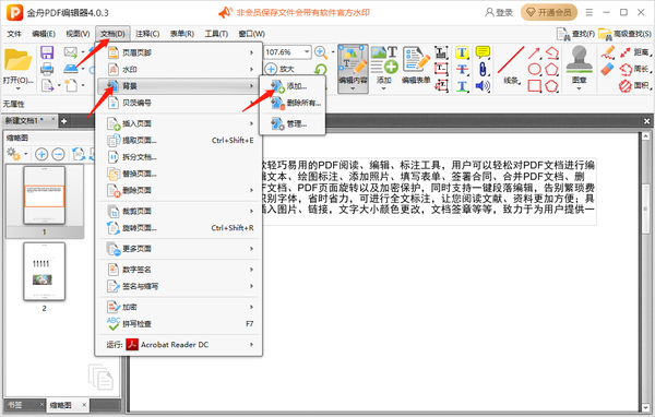 1、打开要编辑的文件后,点击菜单栏【文档】,选择【背景】,点击【添加】。