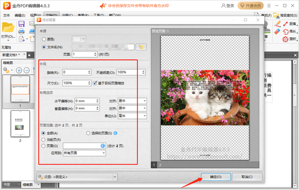 3、添加后,可以编辑外观、布局选项以及页面范围等,右侧可以预览效果,最后点击【确定】即可。