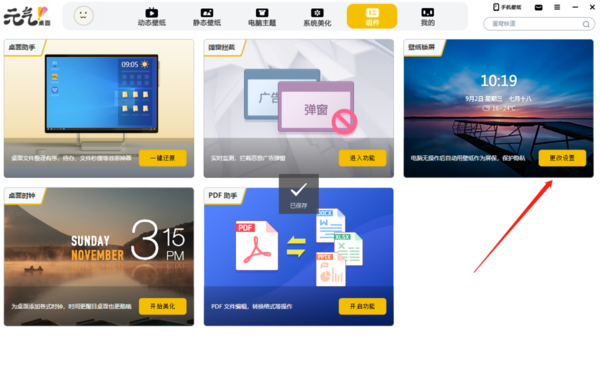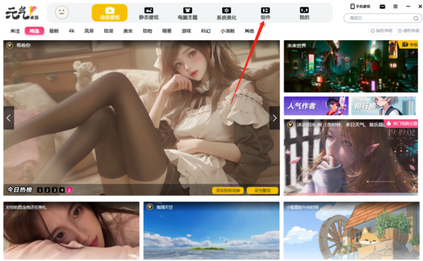 1、打开元气壁纸,在主界面中选择上方的【组件】;