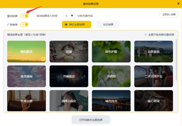我们也可以在这里设置锁屏笔记进入时间、关闭广告推荐、选择壁纸类型、立即打开锁屏壁纸等等,这些功能都是默认打开的,如果大家刚刚下载的话,不需要此功能就要在这里将其关闭。