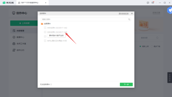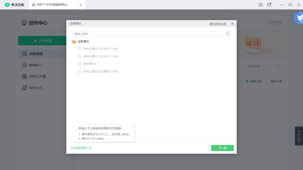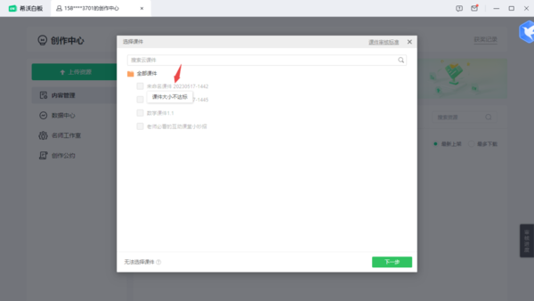 在上传课件的选择窗口中,我们将鼠标的光标放在想要上传却无法选择的课件上,此时软件会弹出提示,比如【课件大小不达标】、【课件同步次数不达标】;如果是【课件大小不达标】的话,再进入到该课件中,添加相关的内容,使得课件的大小超过1000K即可。