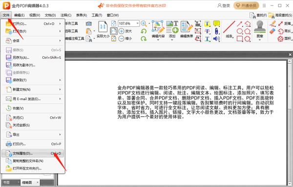 1、用金舟PDF编辑器打开需要添加安全密码的pdf文件,点开菜单栏中的【文件】,选择【文档属性】。