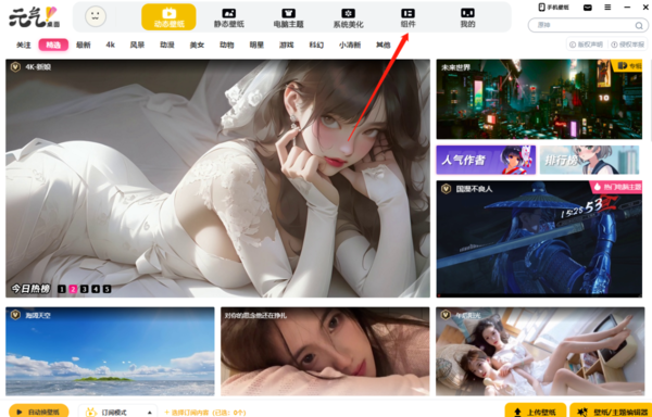1、下载元气壁纸之后,打开软件,在主界面上方找到【组件】一栏;