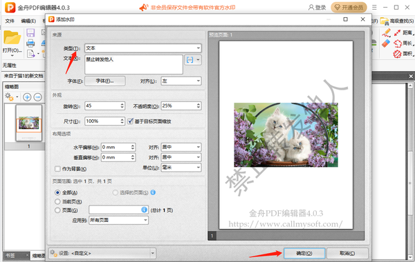 3、点击【类型】选择水印方式,文本指的是文字水印,文件指的是图片水印。同时可以修改文本内容和字体;设置水印样式,包括外观,布局选项和页面范围,在右侧可以预览效果,点击【确定】后保存即可。