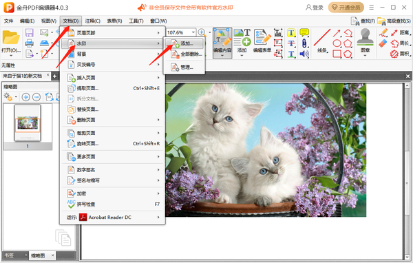 2、点击上方菜单栏【文档】,选择【水印】后点击【添加】。