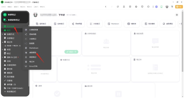 1、打开印象笔记,点击右侧【更多新建】,在弹出的菜单中,点击【桌面便签】。