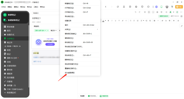1、右击需要设为桌面便签的笔记,点击【设为桌面便签】。