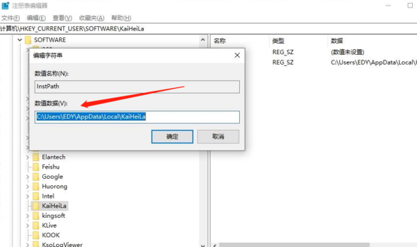 4、或者输入【\HKEY_CURRENT_USER\SOFTWARE\KaiHeiLa】,找到【InstPath】并双击,在弹出的窗口中,将【数值数据】下面的地址复制下来;