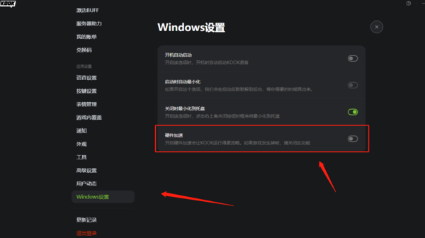 1、打开KOOK的设置界面,在【Windows设置】中,将下面的【硬件加速】给关闭;