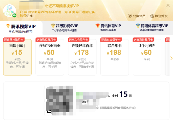 腾讯视频的会员相对来说还是很便宜的,如图可以看到包月也仅需15元,大家若是包的期限多那么优惠也更多。