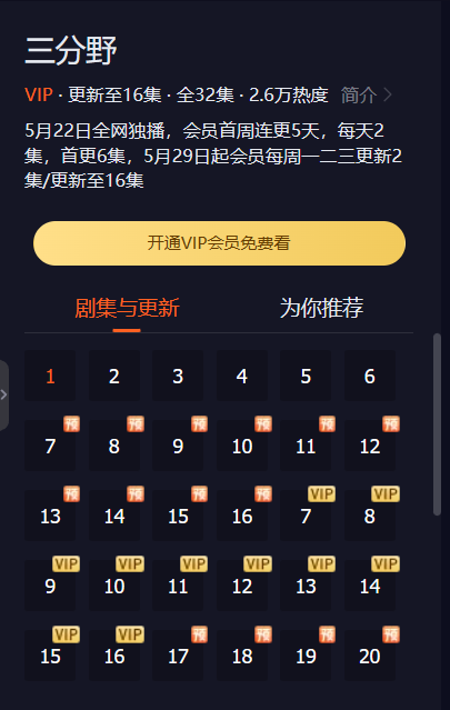 根据【腾讯视频】官方给出的信息,可以看到电视剧《三分野》一共32集,现如今已经更新至16集,现在刚刚过去电视剧的播出首周,首周连续更新5填,每天2集,自5月29日起每周一二三更新2集。