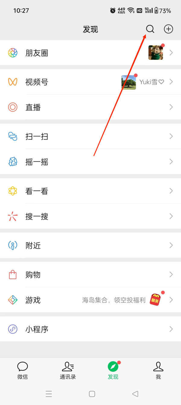 第二步,启动手机端的微信,然后点击界面右上角的【搜索】图标。