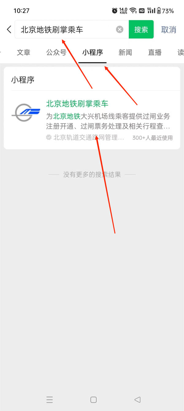 第三步,然后搜索【北京地铁刷掌乘车】小程序。