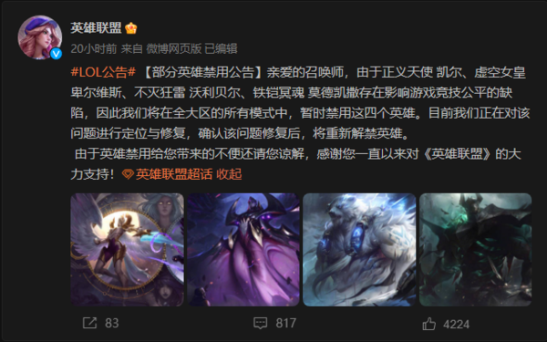 不知道大家有没有注意到,就在近日,英雄联盟官方微博发布英雄禁用的公告,宣布【正义天使-凯尔】、【铁铠冥魂-莫德凯撒】、【不灭狂雷-沃利贝尔】以及【虚空女皇-卑尔维斯】这四位英雄将被暂时禁用,而且不仅在排位中,是全大区全模式的禁用,而官方给出的理由是这四位英雄影响了竞技公平,将在修复后重新解禁。