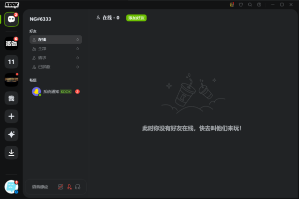 1、KOOK界面简约大气,如图可以看出,在KOOK中,界面板块划分的特别舒适,而且字体大小都妥当,图标圆润,看上去没有像办公软件一样标准化,所以显得非常放松,非常搭配游戏的那种轻松状态。且色调这一块,也很养眼,很符合大家夜晚开黑印象。