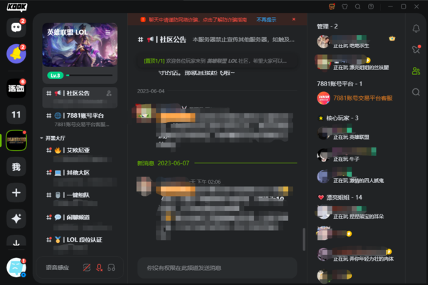 2、在KOOK中拥有每一款游戏的专区频道,而且我们还可以自己创建频道邀请经常开黑的朋友们,比如我们进入了【英雄联盟】频道,在这里可以一键组队开黑,还可以将自己的游戏段位等信息公示出来,和大家一起聊天,方便大家交友。