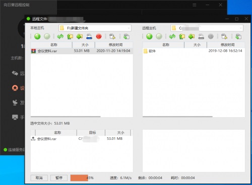 对于在家办公的人来说最常用的功能还是文件传输功能。由于在家工作的原因 , 需要在家中以及公司的台式电脑之间传输文件 , 远程文件功能即免去了随时携带移动硬盘跟麻烦同事只苦 , 又避免了突发工作任务而手边缺少必要资料的尴尬。