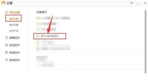 第三步:进入“常规设置”下面的“基础设置”界面后,在“快捷操作”选项下,勾选显示U盘托盘图标即可。