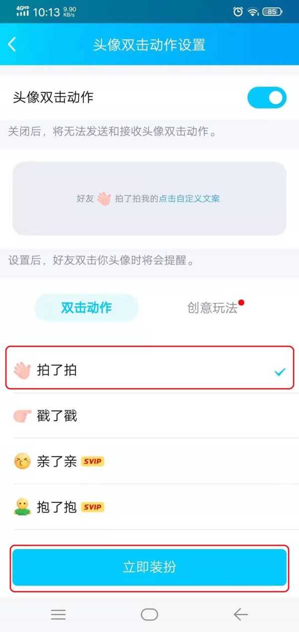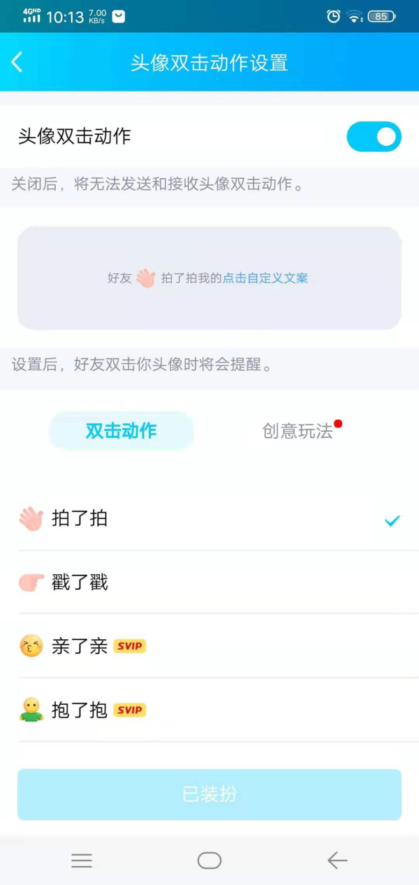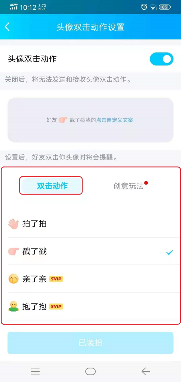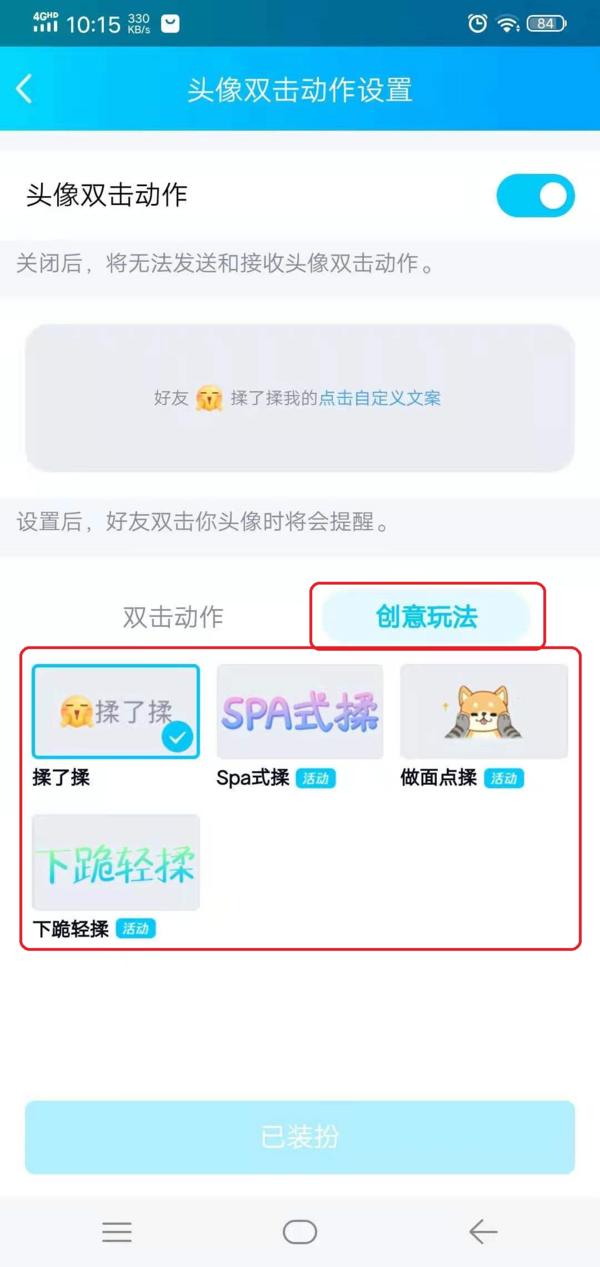 第九步,同时,在头像双击动作设置界面中,点击【双击动作】右侧的【创意玩法】,我们还可以对拍了拍或揉了揉的动作设置不一样的动作玩法。