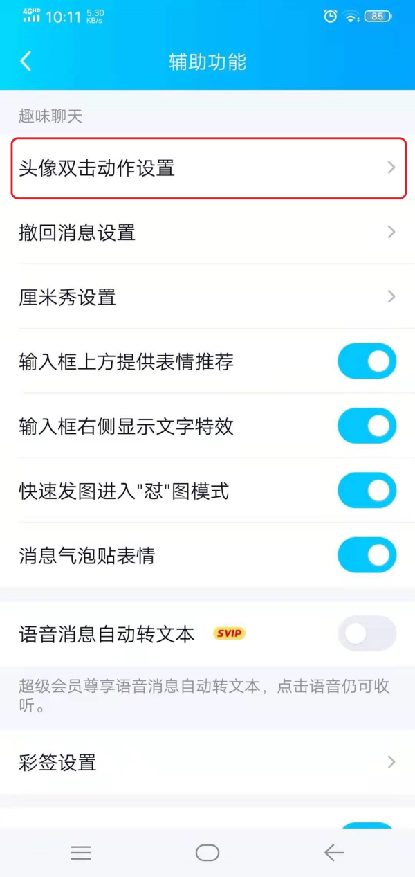 第五步,进入到QQ的辅助功能设置界面当中后,找到【头像双击动作设置】选项,并点击打开。