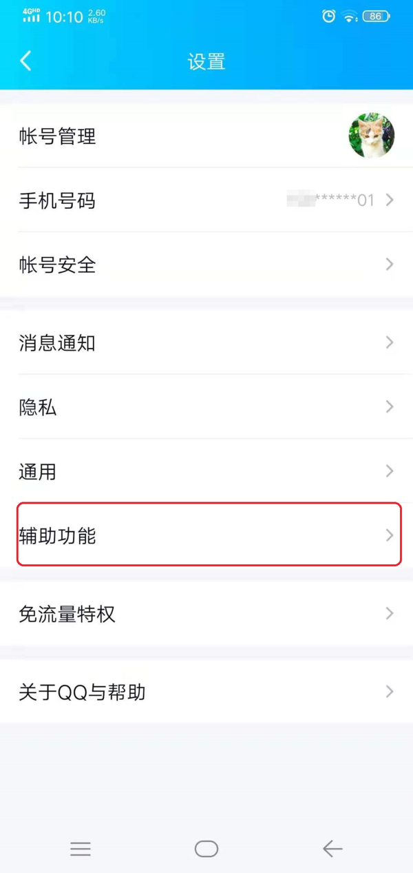 第四步,然后在弹出的QQ设置界面中,找到【辅助功能】选项,并点击进入。