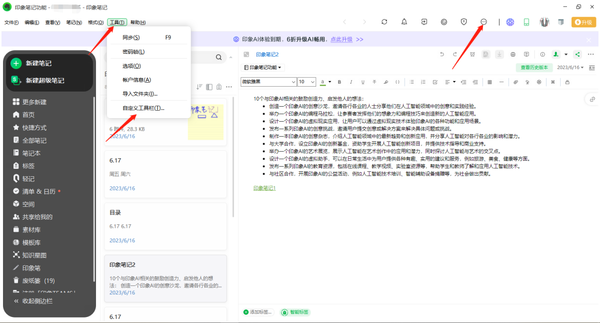 1、点击印象笔记菜单栏【工具】-【自定义工具栏】,或者直接点击右上方工具栏中的【更多功能】。