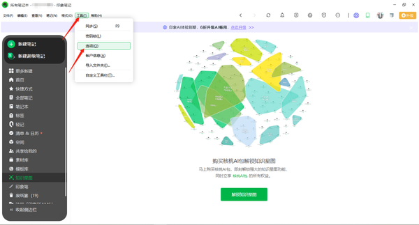 1、打开印象笔记,点击菜单栏中的【工具】-【选项】。