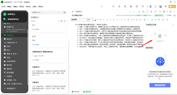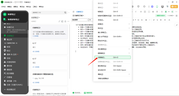 1、打开印象笔记,在【全部笔记】列表页打开需要进行关联的笔记,点右击选择【关联笔记】,或者快捷键【Ctrl+O】。