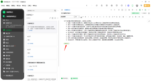 2、可以看到选中的笔记会自动变成一个超链接显示在目录列表中,点击超链接即可快速进入笔记中。