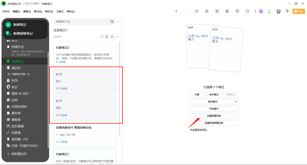 1、按住Ctrl键同时选择多条笔记,在笔记右侧的界面中,点击【创建普通目录】。