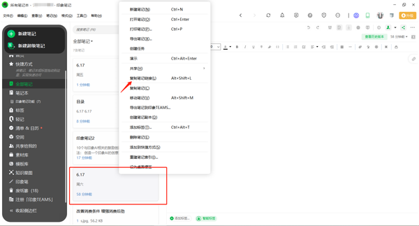 1、在笔记列表中选择需要关联的笔记,单击鼠标右键,选择【复制笔记内部链接】。