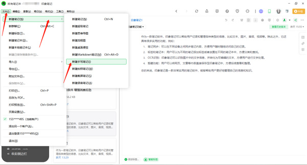 1、打开印象笔记,点击菜单栏【文件】-【新建笔记】-【新建手写笔记】。