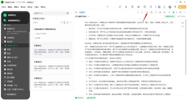 1、打开电脑版印象笔记,选择需要添加提醒的笔记并打开,点击右上角闹钟图标,即【提醒】功能。