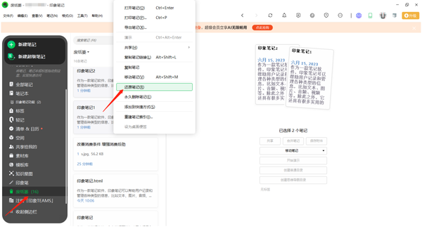 1、打开印象笔记,在左侧菜单栏找到【废纸篓】,找到误删的笔记,右键选择【还原笔记】(可以按住Ctrl同时选中多条笔记)。