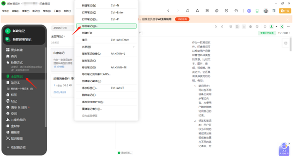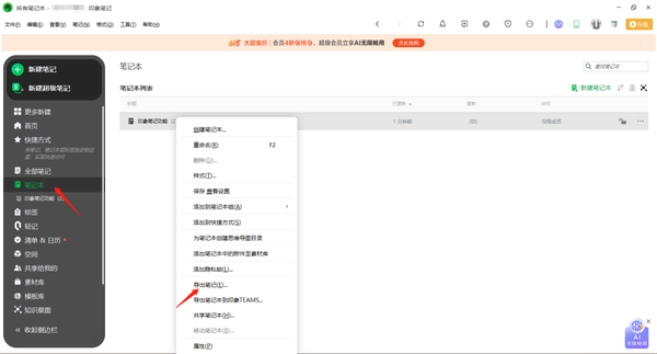 6、也可以对整个笔记本进行导出,在【笔记本】列表页选择需要导出的笔记本,右击选择【导出笔记】即可将该笔记本内的所有笔记导出。