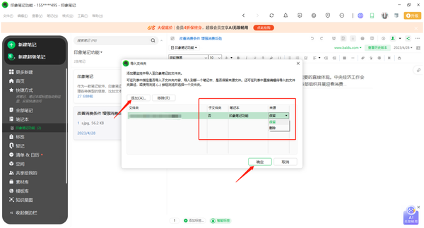 2、点击【添加】,选择需要导入的文件夹。可以设置子文件内的文件是否需要导入,仅支持导入最多一层子文件夹;还可以设置导入的笔记放入哪个笔记本中;以及是否删除源文件。然后点击【确定】即可导入。