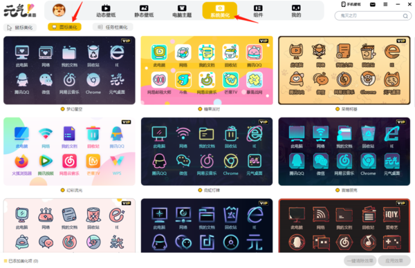 打开元气壁纸,在主界面中上方找到【系统美化】,随后在下方分栏中找到【图标美化】,如图所示,这里有非常多的图标美化风格,也可以搜索自己喜欢的风格,设置之后桌面快捷方式和图标都会变成同一种风格,看着就非常整洁。