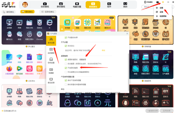 在右上角【三】出打开元气壁纸设置中心,左侧选择【基本设置】,右侧下拉列表找到【桌面整理】,勾选【开启图标整理】即可。